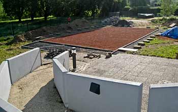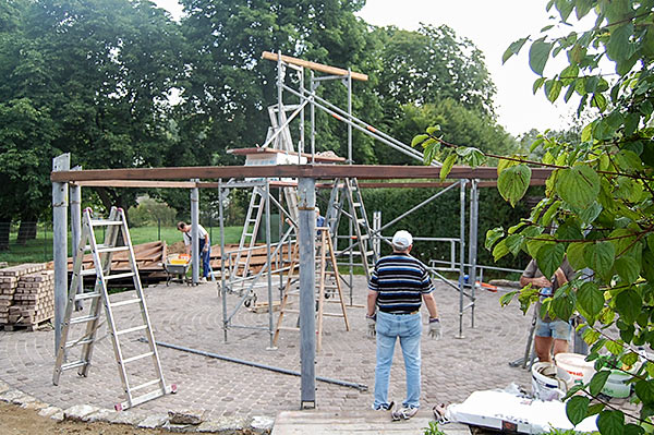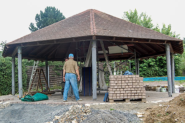 Die Fundamente für die Grillhütte sind gelegt, die Stützen für das Grilldach eingebaut und die Pflasterung fertiggestellt.