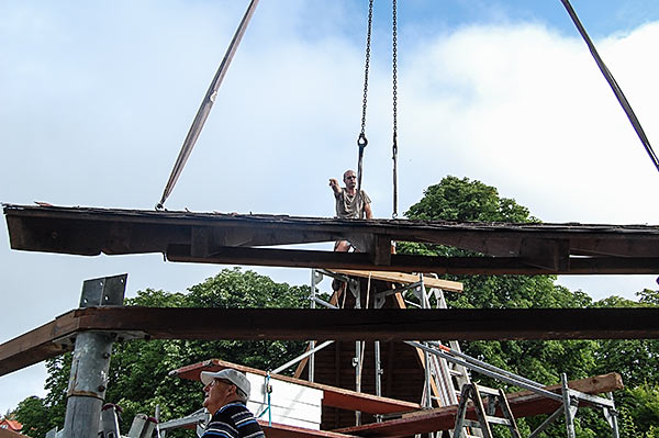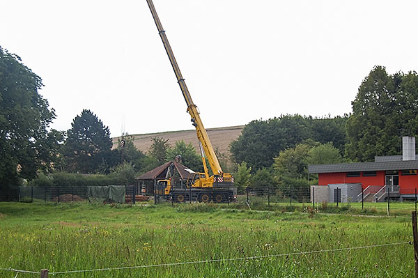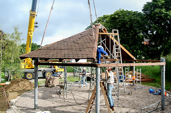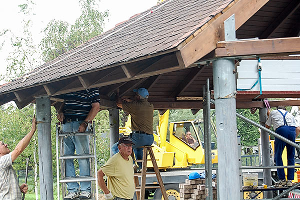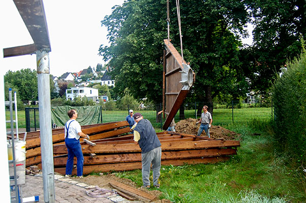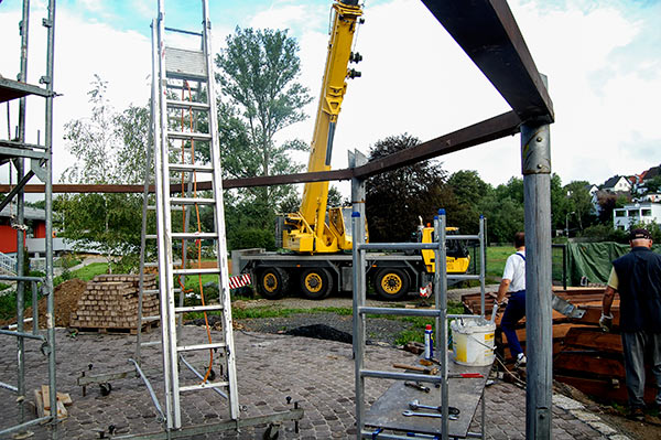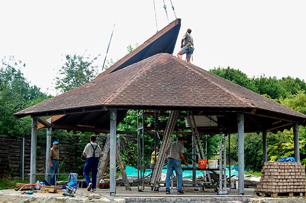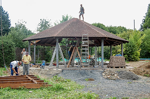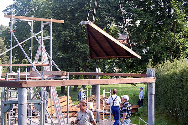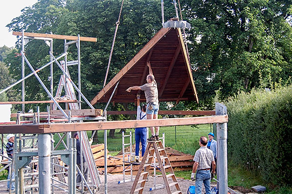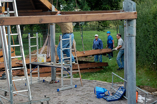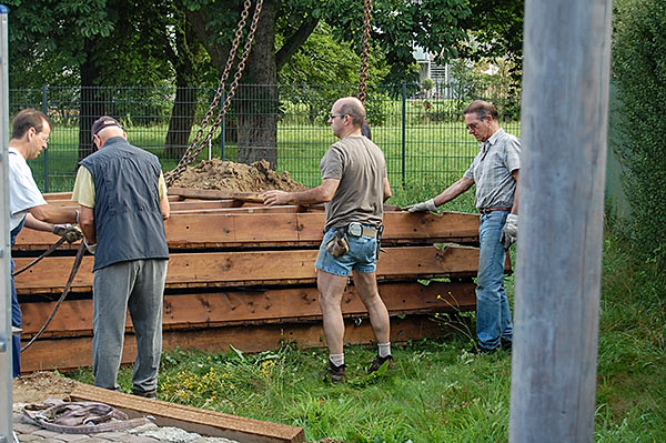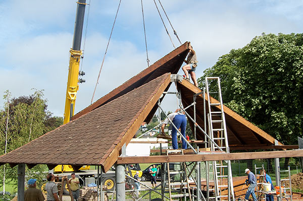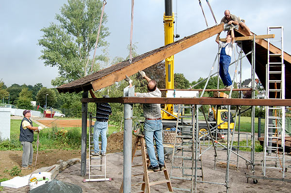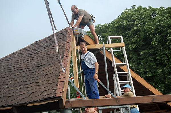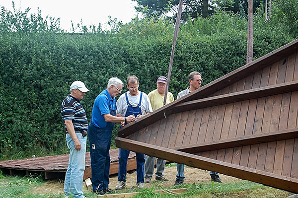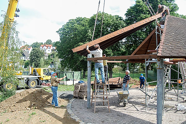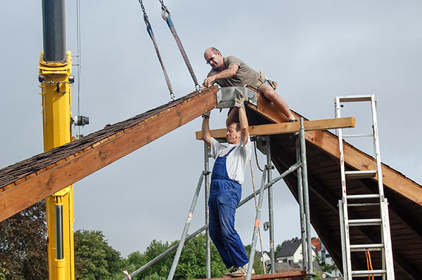 Das Grillhüttendach wird installiert. Die Montagsturner (H. Baum, W. Breitwieser, R. Dasbach, W. Fischer, G. Reichert, Th. Rödel, H. Seifert) und Vorstandsmitglied Stefan Michel legten Hand an, um zusammen mit einem Kran das Dach der Grillhütte zu errichten. Nach ca. 5 Stunden war das schwierige Werk vollendet.