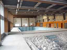 Im Untergeschoss sowie im ehemaligen Hallenbadbereich wurden alle Einrichtungen entfernt, die Zwischenmauer im Halllenbadbereich ebenfalls.