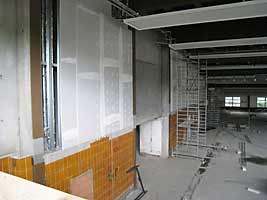Die ersten Wandausfachungen oberhalb der alten Fliesen auf der östlichen Hallenseite sind mit Gipskarton verkleidet und verspachtelt.