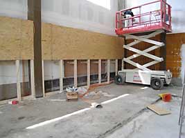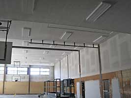 Die Hallendecke wurde fertiggestellt, die Lampen aufgehängt. Ebenso wurde die Konstruktion für die Kletterseile etc. an der Decke montiert.