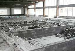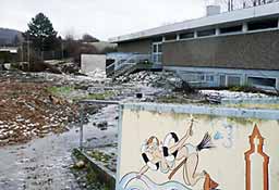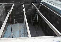 Im Innern des alten Hallenbades wurden die Becken verfüllt. Im Bereich des Sprungturmes wurden im Becken Mauern hochgezogen, damit hier entsprechende Räume entstehen können.