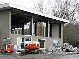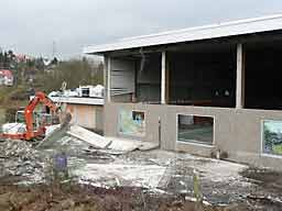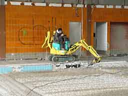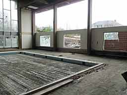 Der Innenausbau geht weiter. Feinarbeiten und Vorbereitungen an der neuen Decke (Hallenboden) und Beseitigung der großen Fenster.