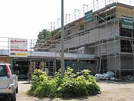 Auf der Nordseite und der Westseite sind die Rahmen der Zimmerleute so weit vorbereitet, dass bereits die ersten Fenster montiert werden können.
