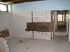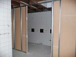 Auch in den anderen Räumen geht der Innenausbau weiter. In den Nassräumen wurden die Wandschlitze von den alten Duschen in Eigenleistung zugemauert und beigeputzt. Stellwände für die Duschen sind gesetzt.