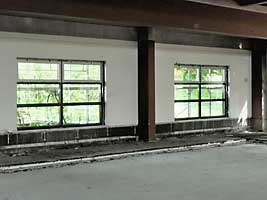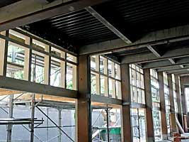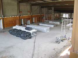 Einige Fenster sind bereits fertig installiert. Im Hallenbereich liegen die Deckenheizpaneelen bereit zum Einbau.