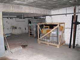 Im Keller wird Ende Mai der Heizkessel vor dem Pelletlager aufgestellt, Material steht bereits im Keller bereit.