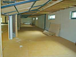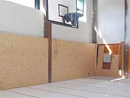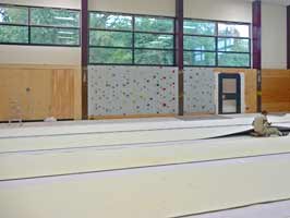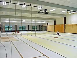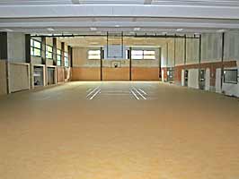 Der Blick in die Halle und Geräteräume zeigt, dass die Verlegung des Bodens abgeschlossen ist.