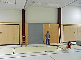 Die „Filzschneider“ sind am Werk, um die Prallschutzwände mit Filz zu bekleben.