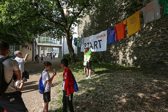 Dafür, dass niemand dehydrierte, sorgte die Idsteiner Zeitung und versorgte die Läufer auf der Strecke und am Ziel mit Wasser. Dort konnten sie auch ihr „Finisher-Shirt“ abholen, das in diesem Jahr in klassischem Weiß erstrahlte. Dazu gab es einen blauen Turnbeutel und einen Getränkegutschein für das Weinfest. Die zahlreichen Shirts der letzten Jahre waren auf dem Schulhof der Pestalozzischule in bunter Reihe aufgehängt.