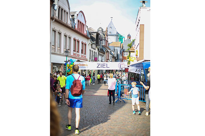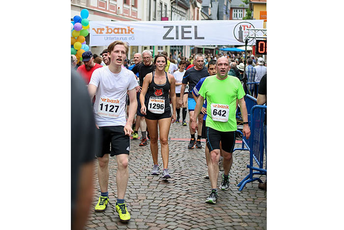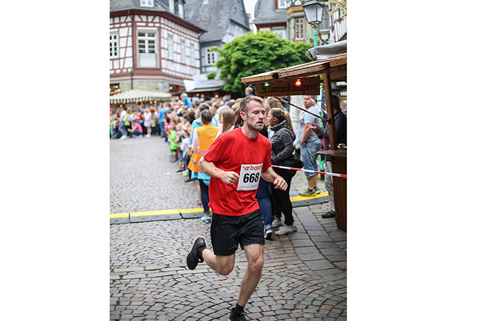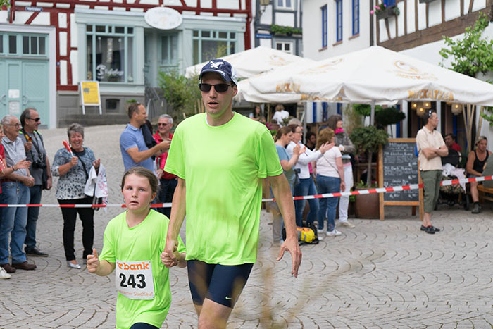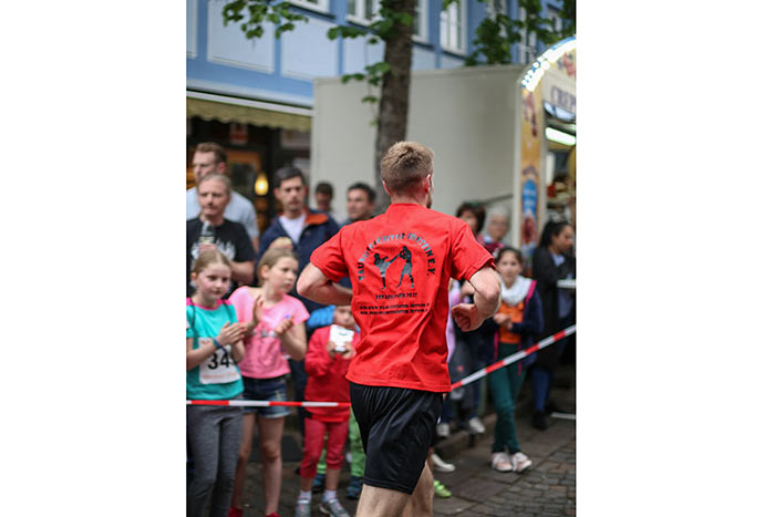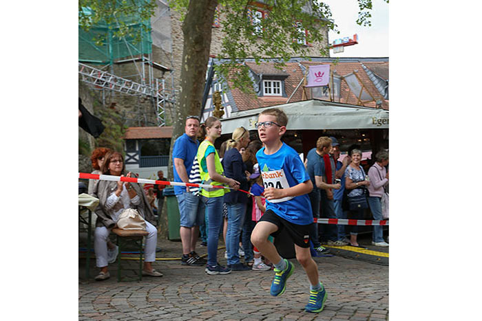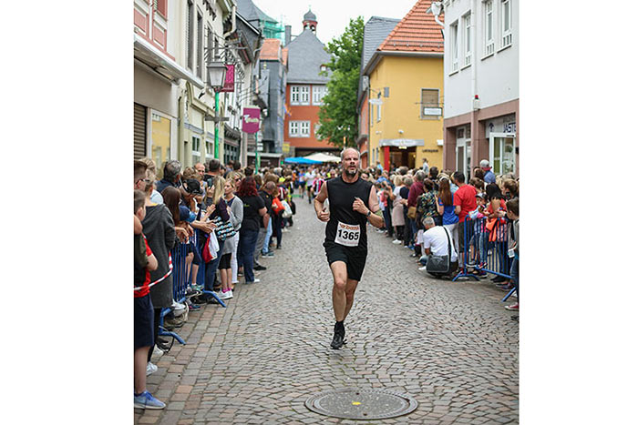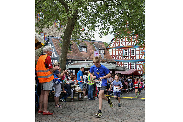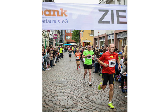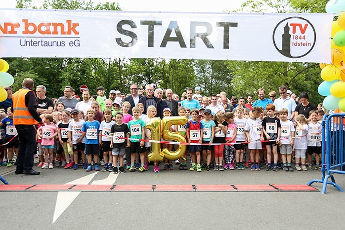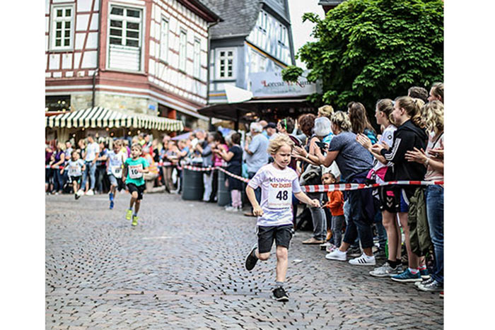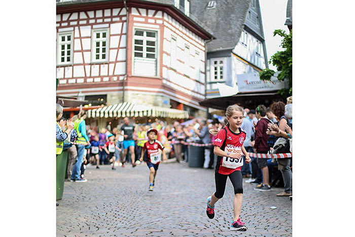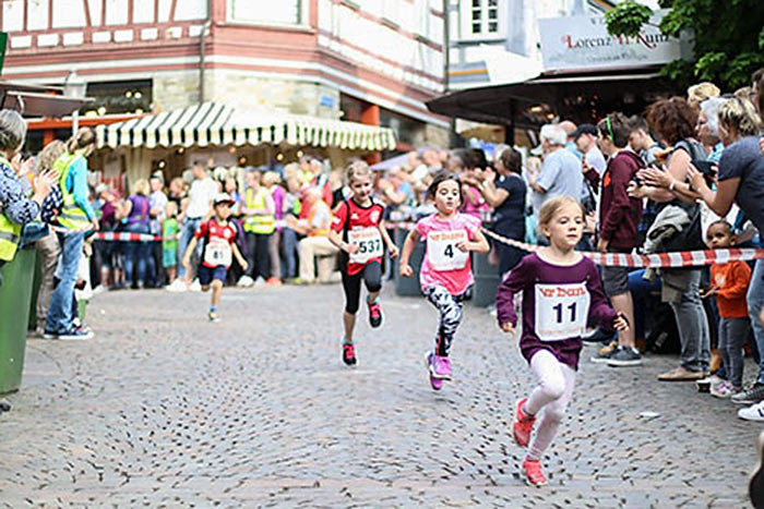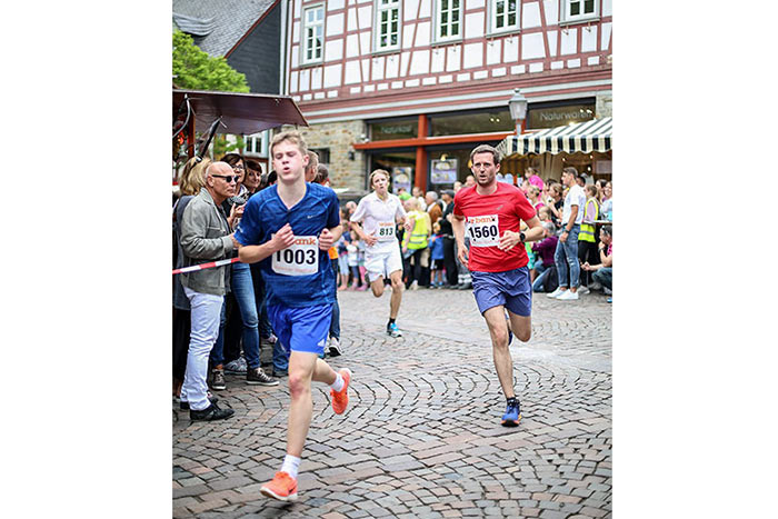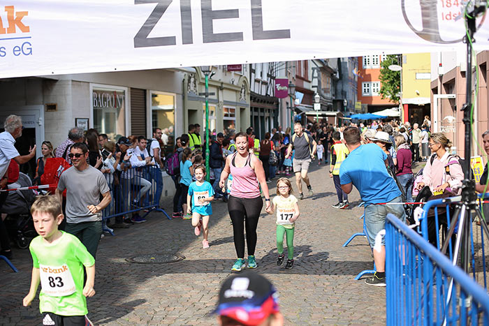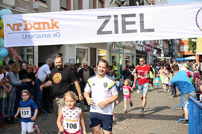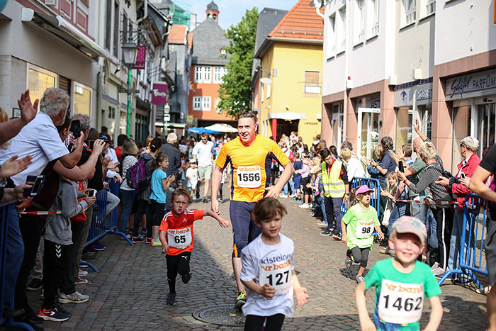 IDSTEIN – In der Altstadt stehen jubelnde Menschen, Hunderte Läufer mühen sich ab. Besonders auf den letzten Metern durch die Fußgängerzone und auf dem König-Adolf-Platz, vorbei an den Ständen des Weinfestes, werden sie durch laute Rufe nochmal motiviert. Wenn man diese Bilder in Idstein sieht, dann ist wieder Stadtlauf. Und das dieses Jahr zum 15. Mal. Längst hat sich der Idsteiner Stadtlauf, organisiert von der VR-Bank, der Stadt und dem TV Idstein, etabliert im sportlichen Veranstaltungskalender der Region. In vier Kategorien starteten insgesamt fast 1500 Läufer: Der Kinderlauf ging über die Distanz von einem Kilometer, der Schülerlauf über 2,3 Kilometer, der „Jedermannslauf“ über fünf Kilometer vom Schloss durch die Stadt bis zum Ziel in der Rodergasse. Über diese Distanz konnte sowohl gelaufen als auch gewalkt werden. Beim Kinderlauf mit insgesamt 196 Teilnehmern machten zahlreiche Kita-Gruppen mit. Ehrenamtliches Engagement, Ambition und die Bedeutung von Bewegung werden auch den Kleinsten auf diese Art und Weise als Werte vermittelt. Die größte Kindermannschaft stellte wie im vergangenen Jahr die integrative Kita „Am Gänsberg“ mit 42 Kindern. 237 Läufer nahmen am Schülerlauf teil, 952 waren beim „Jedermannslauf“ dabei.