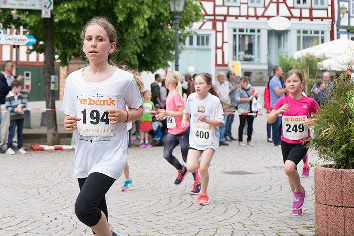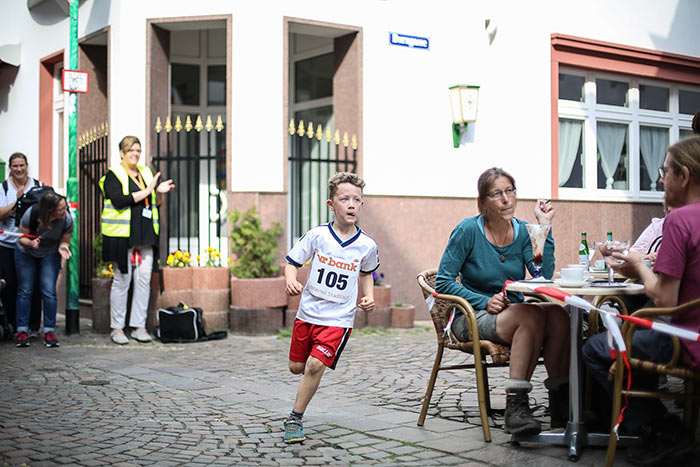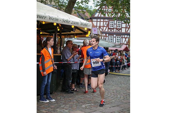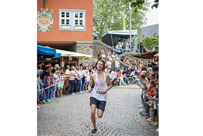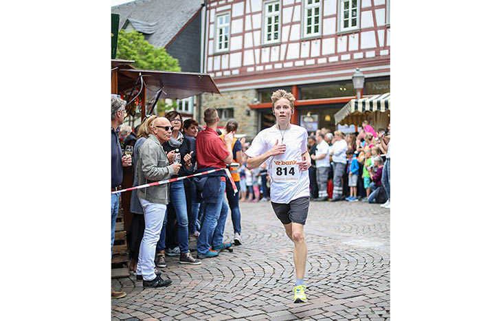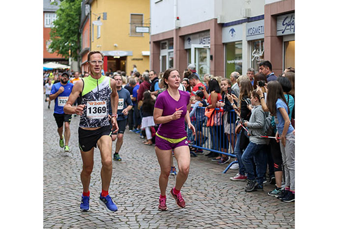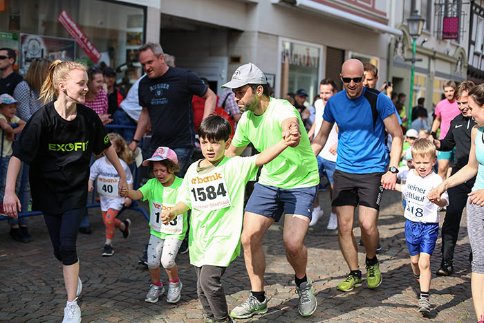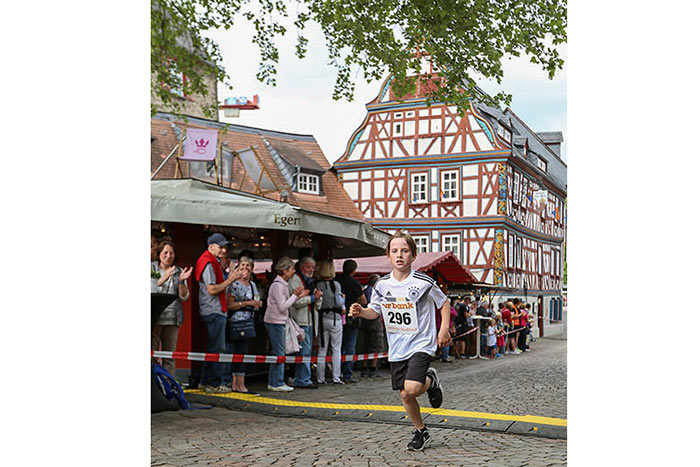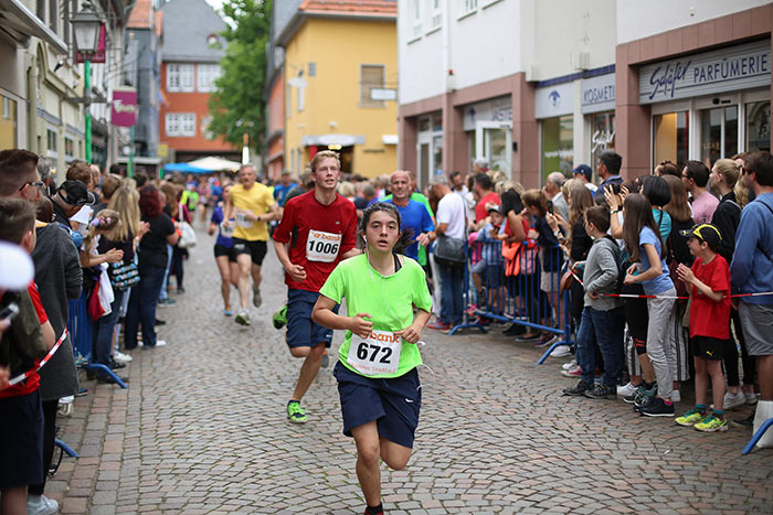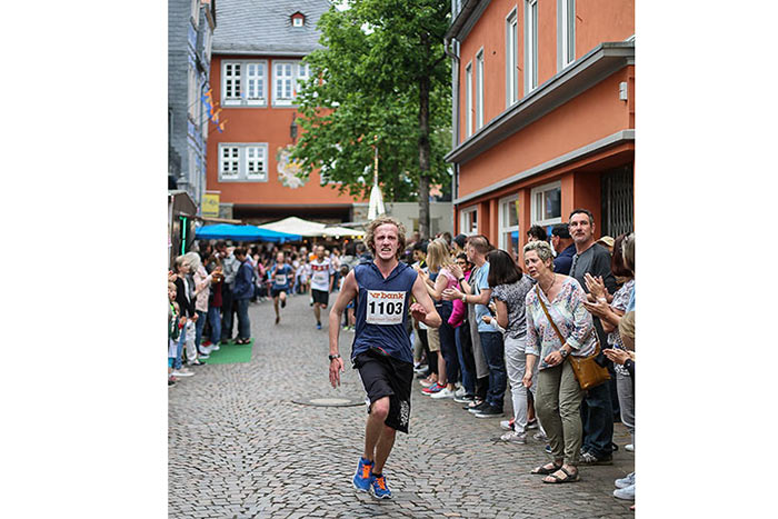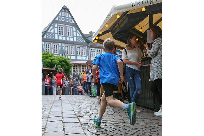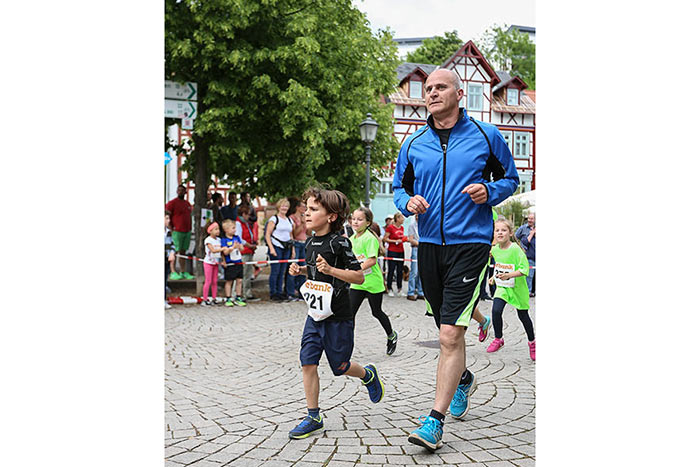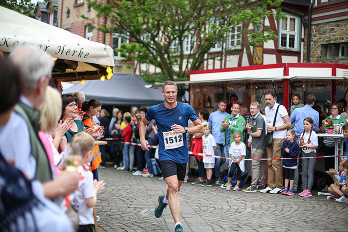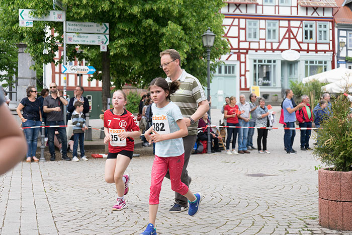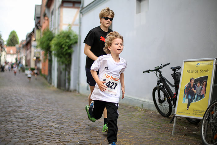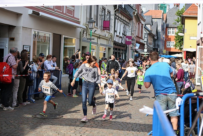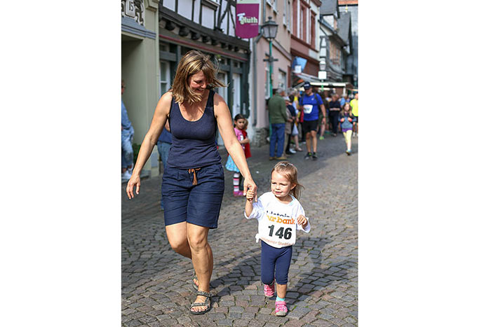 IDSTEIN – In der Altstadt stehen jubelnde Menschen, Hunderte Läufer mühen sich ab. Besonders auf den letzten Metern durch die Fußgängerzone und auf dem König-Adolf-Platz, vorbei an den Ständen des Weinfestes, werden sie durch laute Rufe nochmal motiviert. Wenn man diese Bilder in Idstein sieht, dann ist wieder Stadtlauf. Und das dieses Jahr zum 15. Mal. Längst hat sich der Idsteiner Stadtlauf, organisiert von der VR-Bank, der Stadt und dem TV Idstein, etabliert im sportlichen Veranstaltungskalender der Region. In vier Kategorien starteten insgesamt fast 1500 Läufer: Der Kinderlauf ging über die Distanz von einem Kilometer, der Schülerlauf über 2,3 Kilometer, der „Jedermannslauf“ über fünf Kilometer vom Schloss durch die Stadt bis zum Ziel in der Rodergasse. Über diese Distanz konnte sowohl gelaufen als auch gewalkt werden. Beim Kinderlauf mit insgesamt 196 Teilnehmern machten zahlreiche Kita-Gruppen mit. Ehrenamtliches Engagement, Ambition und die Bedeutung von Bewegung werden auch den Kleinsten auf diese Art und Weise als Werte vermittelt. Die größte Kindermannschaft stellte wie im vergangenen Jahr die integrative Kita „Am Gänsberg“ mit 42 Kindern. 237 Läufer nahmen am Schülerlauf teil, 952 waren beim „Jedermannslauf“ dabei.