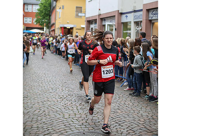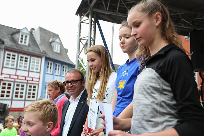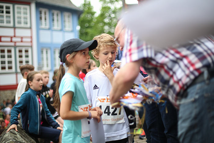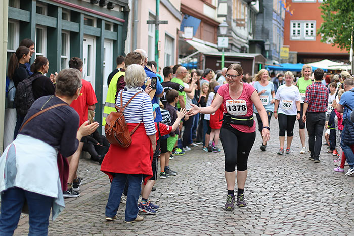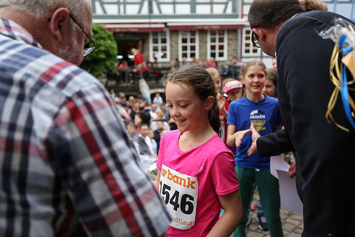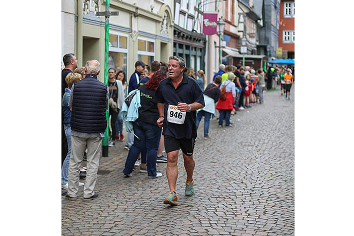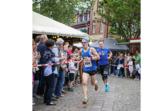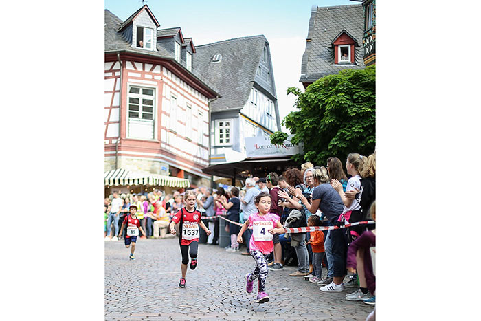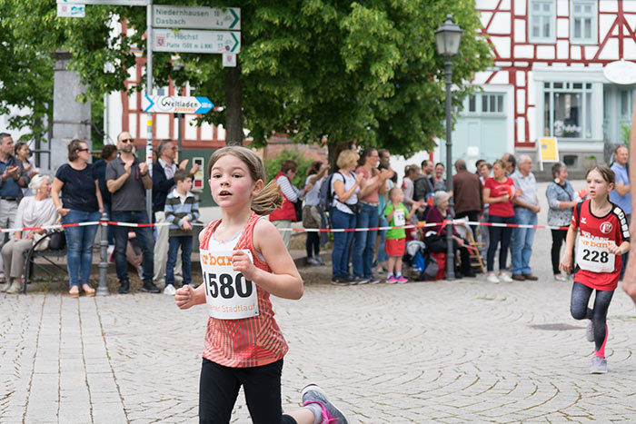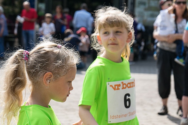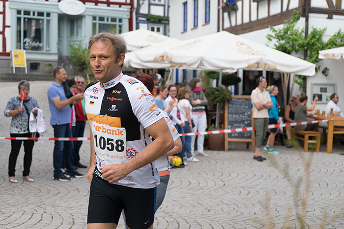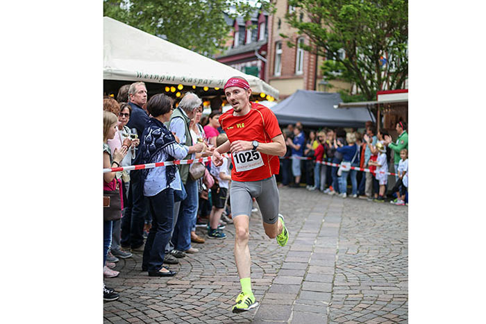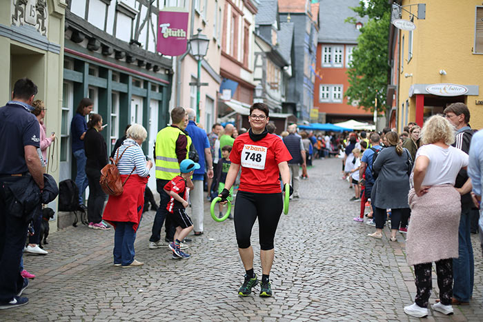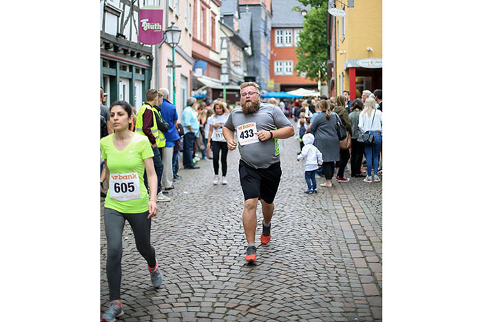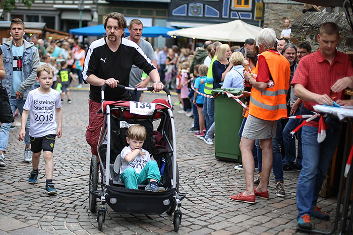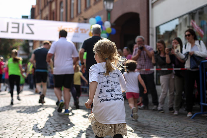IDSTEIN – In der Altstadt stehen jubelnde Menschen, Hunderte Läufer mühen sich ab. Besonders auf den letzten Metern durch die Fußgängerzone und auf dem König-Adolf-Platz, vorbei an den Ständen des Weinfestes, werden sie durch laute Rufe nochmal motiviert. Wenn man diese Bilder in Idstein sieht, dann ist wieder Stadtlauf. Und das dieses Jahr zum 15. Mal. Längst hat sich der Idsteiner Stadtlauf, organisiert von der VR-Bank, der Stadt und dem TV Idstein, etabliert im sportlichen Veranstaltungskalender der Region. In vier Kategorien starteten insgesamt fast 1500 Läufer: Der Kinderlauf ging über die Distanz von einem Kilometer, der Schülerlauf über 2,3 Kilometer, der „Jedermannslauf“ über fünf Kilometer vom Schloss durch die Stadt bis zum Ziel in der Rodergasse. Über diese Distanz konnte sowohl gelaufen als auch gewalkt werden. Beim Kinderlauf mit insgesamt 196 Teilnehmern machten zahlreiche Kita-Gruppen mit. Ehrenamtliches Engagement, Ambition und die Bedeutung von Bewegung werden auch den Kleinsten auf diese Art und Weise als Werte vermittelt. Die größte Kindermannschaft stellte wie im vergangenen Jahr die integrative Kita „Am Gänsberg“ mit 42 Kindern. 237 Läufer nahmen am Schülerlauf teil, 952 waren beim „Jedermannslauf“ dabei.
