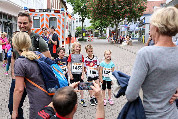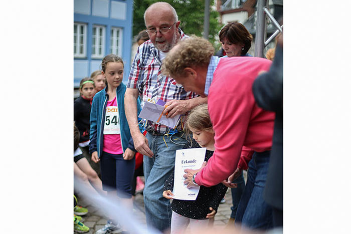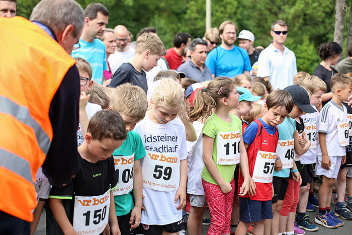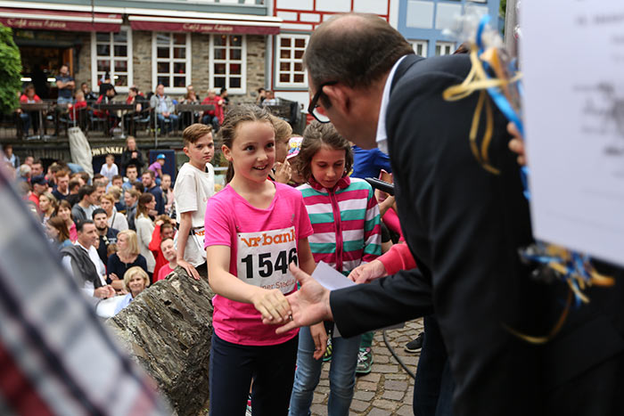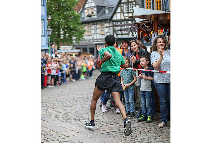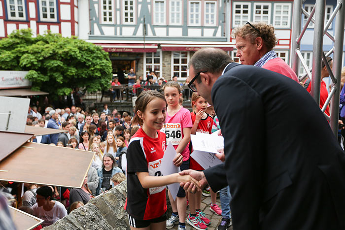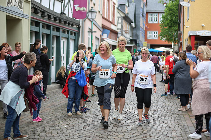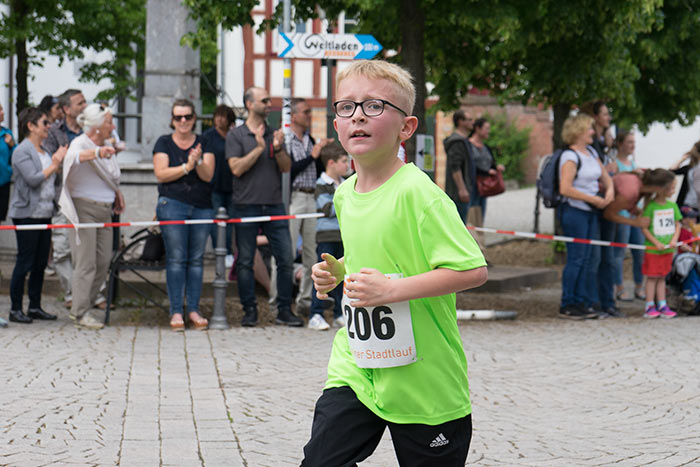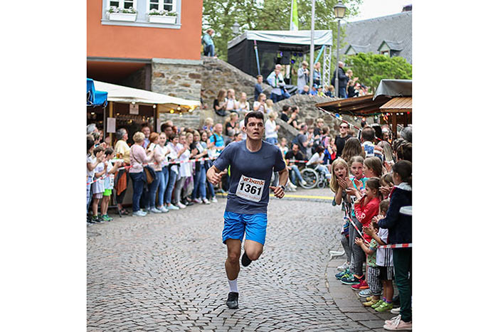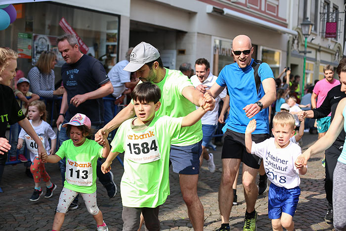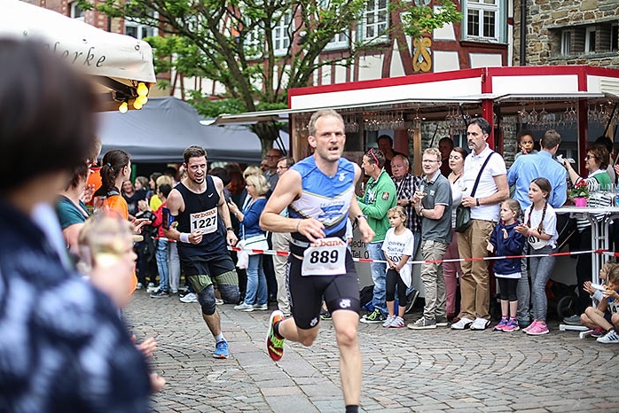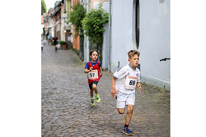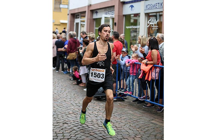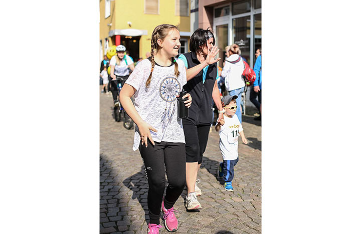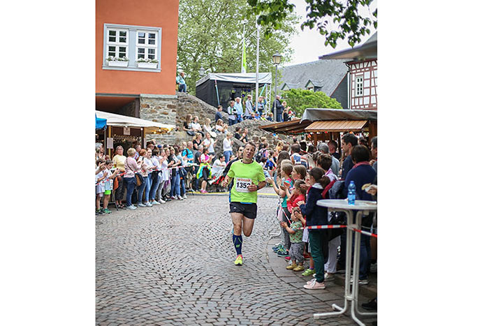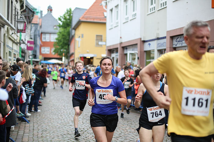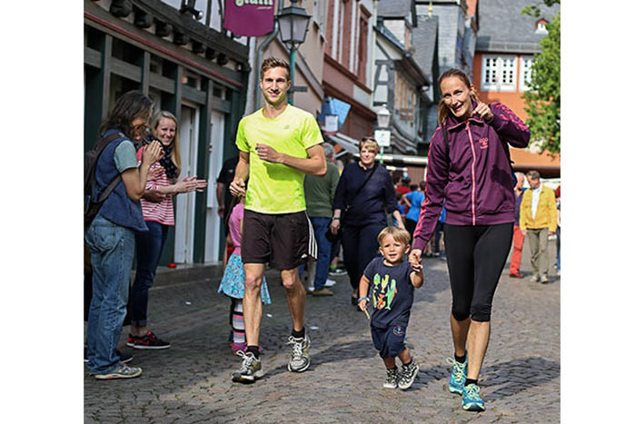 IDSTEIN – In der Altstadt stehen jubelnde Menschen, Hunderte Läufer mühen sich ab. Besonders auf den letzten Metern durch die Fußgängerzone und auf dem König-Adolf-Platz, vorbei an den Ständen des Weinfestes, werden sie durch laute Rufe nochmal motiviert. Wenn man diese Bilder in Idstein sieht, dann ist wieder Stadtlauf. Und das dieses Jahr zum 15. Mal. Längst hat sich der Idsteiner Stadtlauf, organisiert von der VR-Bank, der Stadt und dem TV Idstein, etabliert im sportlichen Veranstaltungskalender der Region. In vier Kategorien starteten insgesamt fast 1500 Läufer: Der Kinderlauf ging über die Distanz von einem Kilometer, der Schülerlauf über 2,3 Kilometer, der „Jedermannslauf“ über fünf Kilometer vom Schloss durch die Stadt bis zum Ziel in der Rodergasse. Über diese Distanz konnte sowohl gelaufen als auch gewalkt werden. Beim Kinderlauf mit insgesamt 196 Teilnehmern machten zahlreiche Kita-Gruppen mit. Ehrenamtliches Engagement, Ambition und die Bedeutung von Bewegung werden auch den Kleinsten auf diese Art und Weise als Werte vermittelt. Die größte Kindermannschaft stellte wie im vergangenen Jahr die integrative Kita „Am Gänsberg“ mit 42 Kindern. 237 Läufer nahmen am Schülerlauf teil, 952 waren beim „Jedermannslauf“ dabei.