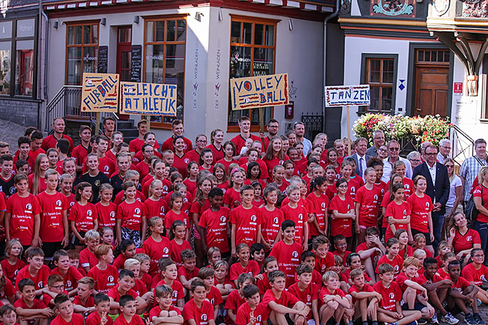 IDSTEIN (red) – Bei strahlendem Sonnenschein eröffnete der Bürgermeister der Stadt Idstein, Christian Herfurth, das 17. Sportcamp des TV 1844 Idstein. Erbedankte sich ausdrücklich bei den Sponsoren, dem Lions Club Idstein, der Flüchtlingshilfe in Verbindung mit der Idstein Stiftung, Tournesol und dem Energieanbieter Süwag für die tatkräftige Unterstützung. Lobende Worte auch für die knapp 35 Helfer unter Leitung der Camp-Chefin Jennifer Ehmig. Und natürlich alle guten Wünsche für eine spannende sportliche Woche an die genau 200 Camp-Teilnehmer aus Idstein und Umgebung. Für den TV1 bedankte sich Vorstandssprecher Andreas Reuther bei Stadt und Kreis für diekostenfrei zur Verfügung gestellten Sportanlagen. Foto: Fotostudio Leidner
