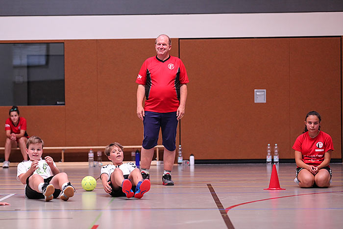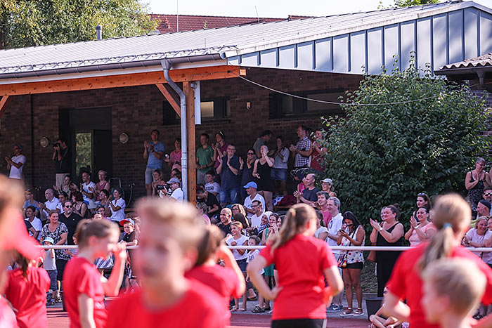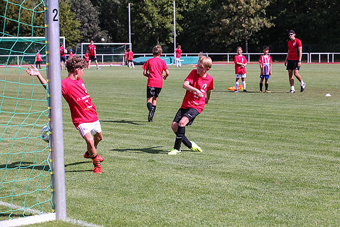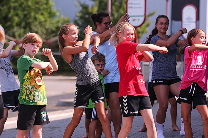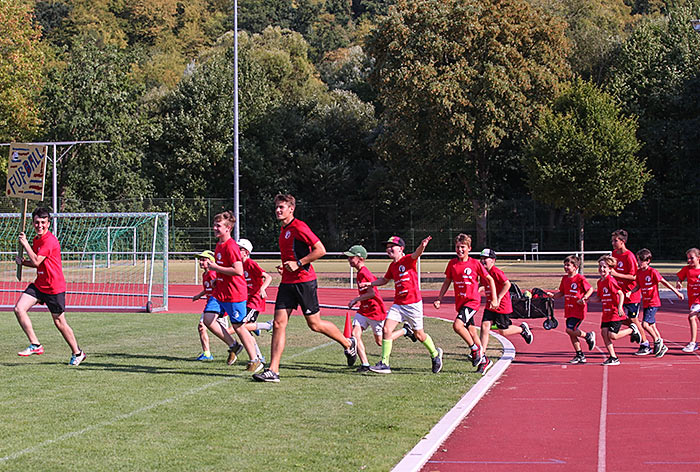 IDSTEIN – Die Fußball-Spielerinnen und -spieler kickten gleich in der prallen Sonne. Die Leichtathleten ziehen sich zumindest zum Aufwärmen an einen schattigen Platz der Sportanlage Zissenbach zurück. Auch vier Turnhallen nimmt der Turnverein (TV) Idstein in der letzten Woche der Sommerferien in Beschlag. Denn bei der 17. Auflage des Sportcamps sind wieder rund 200 Teilnehmende im Alter zwischen acht und 15 Jahren in sieben Sportarten aktiv: Neben Tanzen, Badminton und Leichtathletik werden auch Hand-, Fuß-, Volley- und Basketball angeboten. „Tischtennis ist in diesem Jahr nicht dabei, weil wir keine Trainer gefunden haben, die dafür eine Woche Zeit investieren wollten“, erläutert Jennifer Ehmig, die die sportliche Großveranstaltung organisiert.
