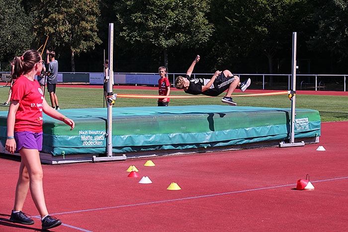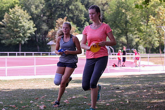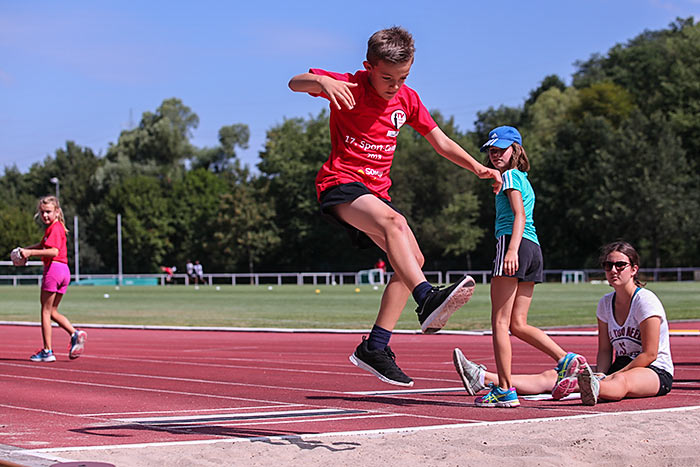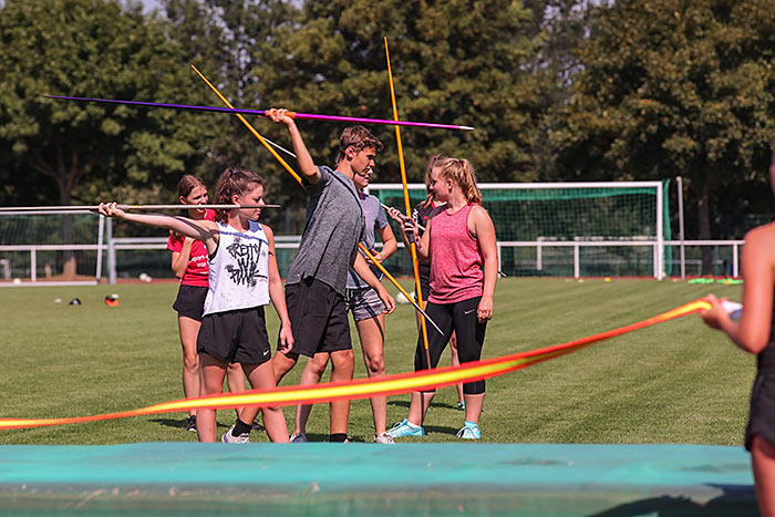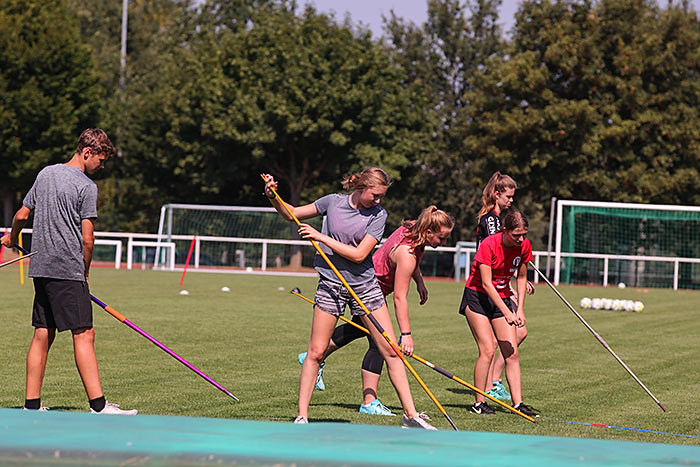 Eine ihrer Kolleginnen ist auch bereits regelmäßig als Übungsleiterin in der Abteilung aktiv und betreut einige der Kinder deshalb schon länger. „Einen von ihnen lasse ich im Training öfter was vormachen, was wir hier gelernt haben“, erläutert die 15-jährige Selina. Schließlich hat man im Rahmen des Sportcamps auch mal Zeit für Dinge, die sonst zu kurz kommen. So stehen bei der Leichtathletik auch technisch besonders anspruchsvolle Disziplinen wie Diskuswerfen, Hochsprung oder Stabhochsprung auf dem Wochenplan. „Das ist schon ein cooles Gefühl, über 2,40 Meter zu springen“, erläutert der 15-jährige Johannes, warum er den Stabhochsprung besonders reizvoll findet. Eigentlich spielt er Fußball, Tischtennis und Badminton, hat sich aber jahrelang mit zwei Freunden als Kompromisslösung für die Teilnahme an der Leichtathletik entschieden. Die bringe ihm viel im Bereich Kondition und Fitness.