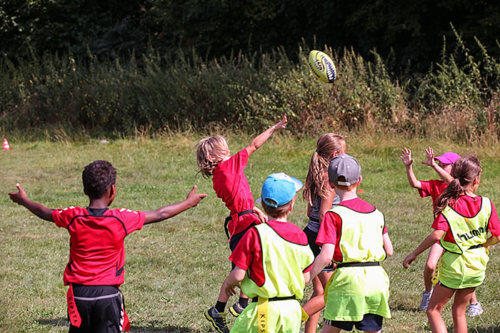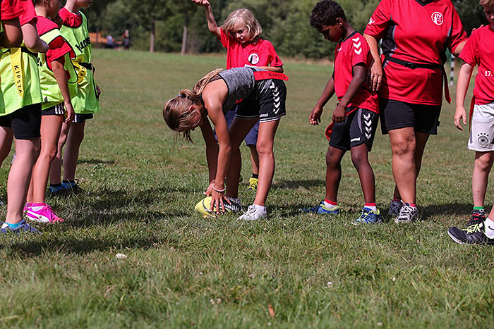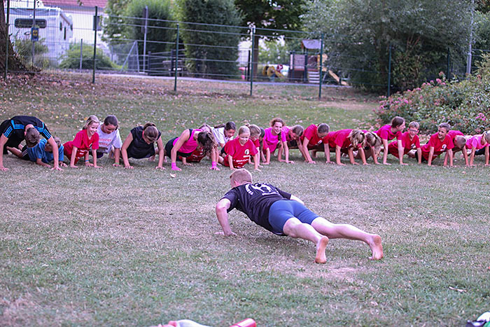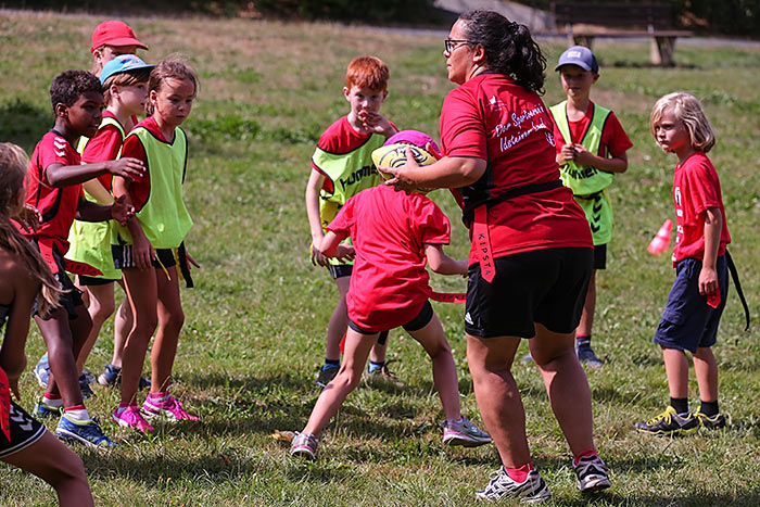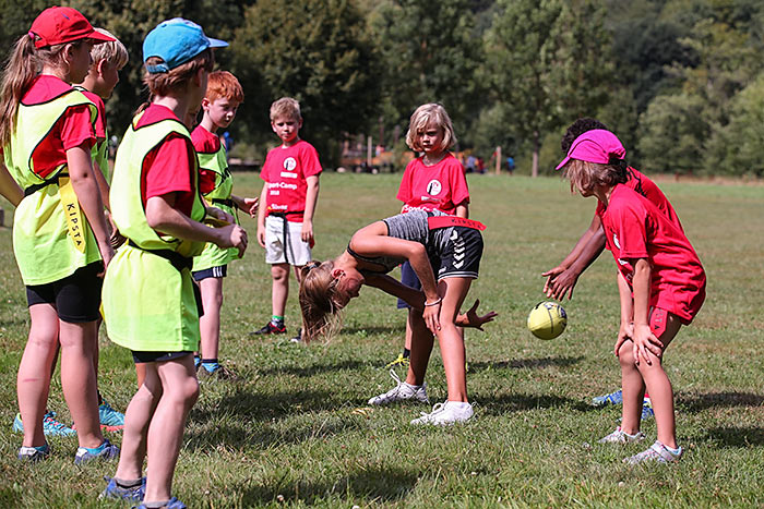 40 Ehrenamtliche sorgen dafür, dass die Teilnehmer während der Woche ihr Sportabzeichen absolvieren, sich mal im Schwimmbad abkühlen können und einige der Gruppen auch den Hochseilgarten besuchen. Einer der Betreuer wird den Teilnehmern im Laufe der Woche außerdem die Sportart Flagfootball vorstellen, eine Variante des American Football. „Wenn es genügend Interessenten gibt, könnte daraus ein Angebot des Vereins werden“, erläutert Ehmig, die beim Turnverein den Fachbereich Fitness und Dance leitet.
