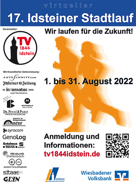 IDSTEIN. 2022 organisiert der TV 1844 Idstein (TVI) als Veranstalter mit Unterstützung der Wiesbadener Volksbank den 17. Idsteiner Stadtlauf – digital. Unter dem Motto „Wir laufen für die Zukunft“ können Jogger und Walker vom 1. bis 31. August daran teilnehmen. Die Stadt Idstein begleitet diesen Wettbewerb in gewohnter Weise. Der Erlös des Stadtlaufs kommt der Erweiterung des regionalen Sportangebots für Kinder und Jugendliche zugute – zum Beispiel für Angebote für Flüchtlingsfamilien zur Teilnahme am Feriencamp des TV Idstein.