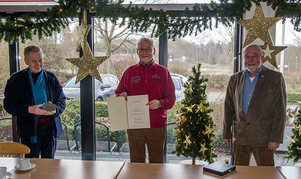 Weitergabe der Plakete und Urkunde durch Archivar Peter Faust (links) und Vorstandssprecher Andreas Reuther (rechts) an den Ehrenvorsitzenden Wolfgang Heller.