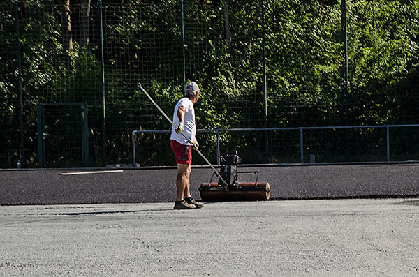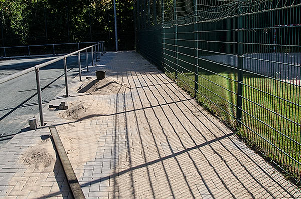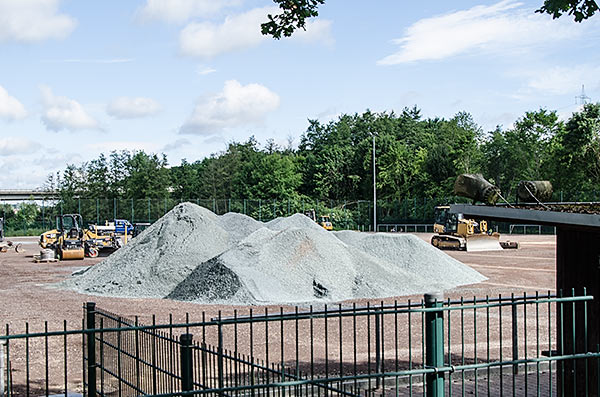 Das Material für die 3 – 4 cm Auasgleichsschicht ist bereits auf dem Platz. In der Zwischenzeit wird der Weg ringsum neu gemacht.