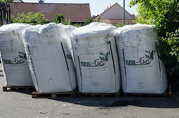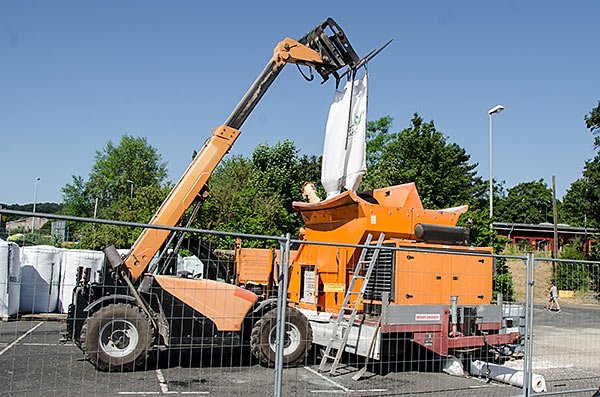 Auf dem Parkplatz ist das Material gelagert, womit vor Ort die elastische Schicht erzeugt wird, die auf dem Platz aufgetragen wird.