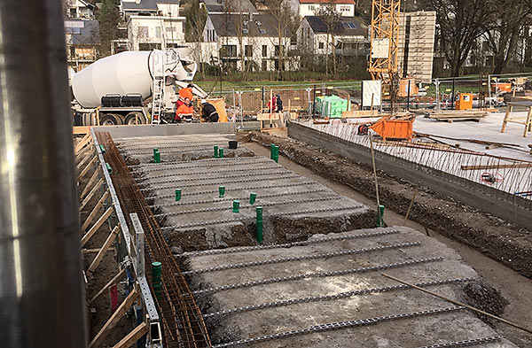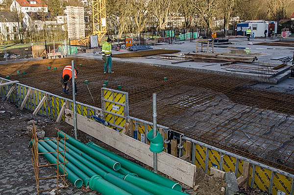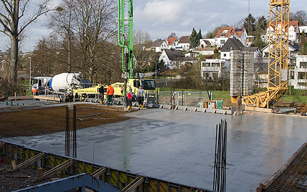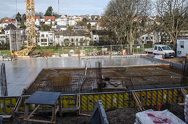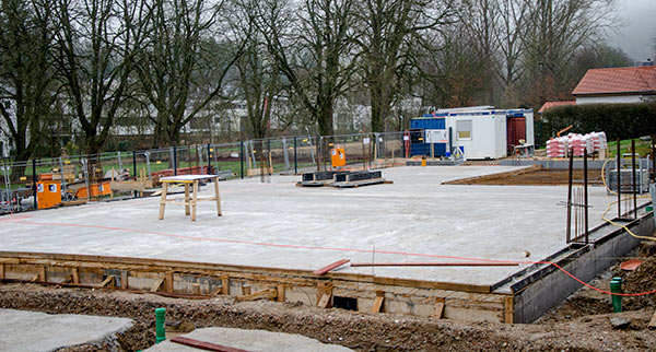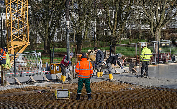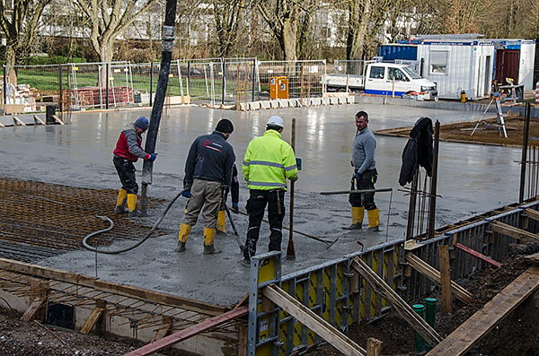 Am 10. Januar wird bei strahlendem Sonnenschein und 8° C die Bodenplatte gegossen.