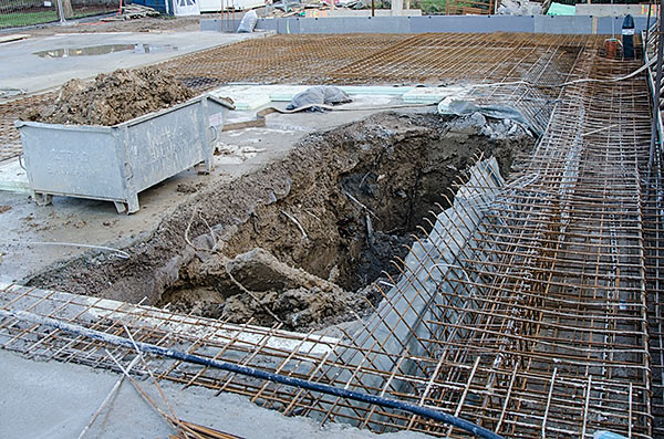 Im vorderen Bereich (Bereich Umkleide und Sanitäranlagen) werden Vorbereitungen getätigt, um Fundamente und Bodenplatte zu gießen.