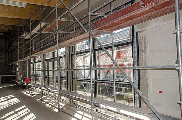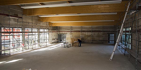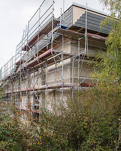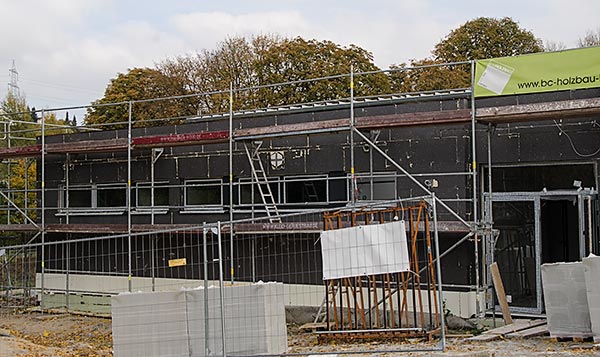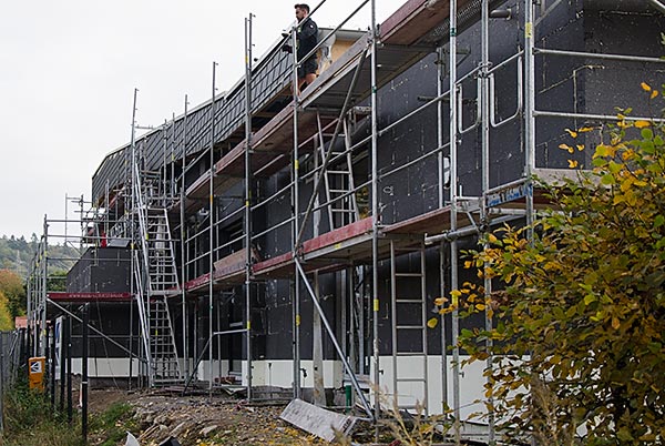 Mitte Oktober ist die Wärmedämmung und Verkleidung angebracht, mit Ausnahme der Rückseite und der Seite zum bestehenden Gebäude.