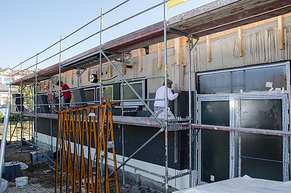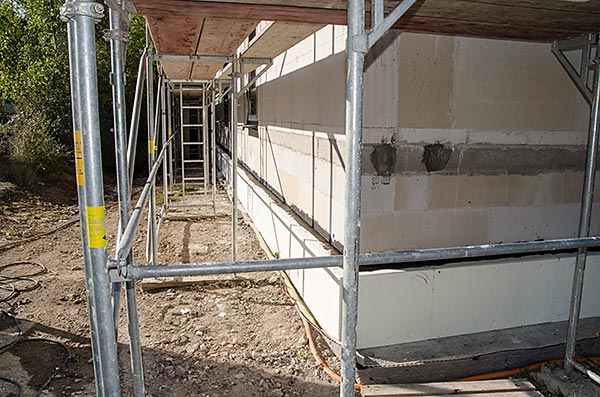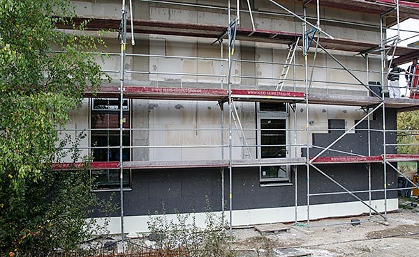 An den Außenwänden wird die Wärmedämmung angebracht.