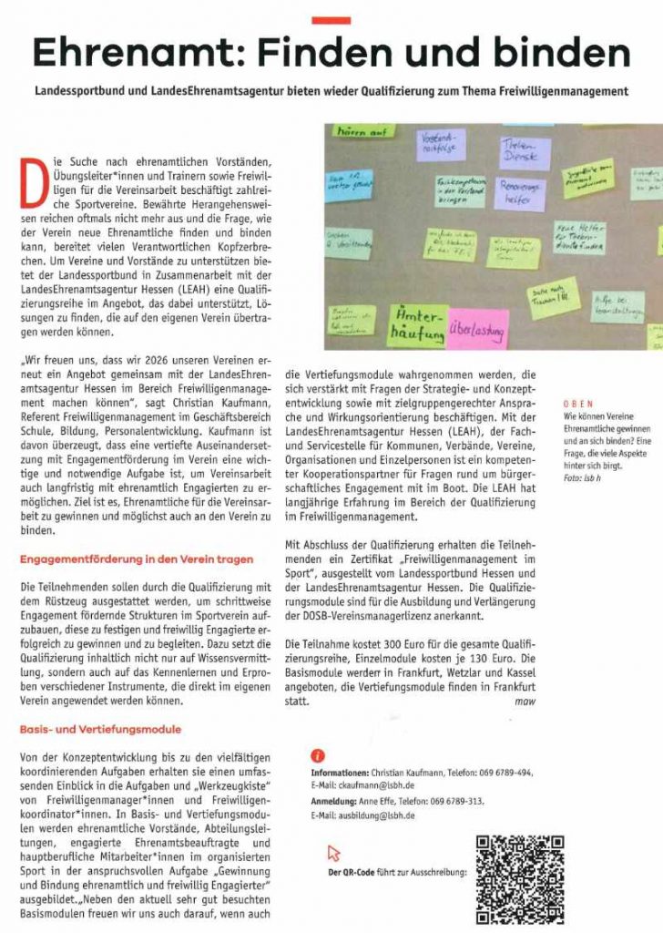 Landessportbund und LandesEhrenamtsagentur bieten wieder Qualifizierung zum Thema Freiwilligenmanagement