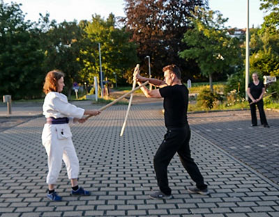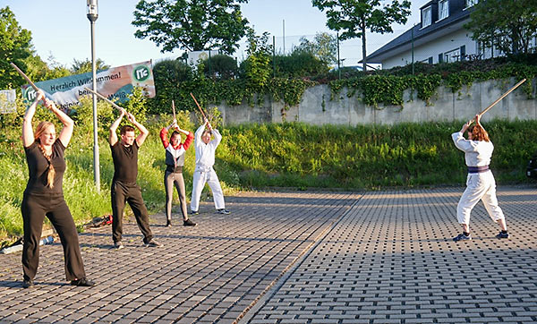 Im Marz kam der 1. Lockdown. Wir waren erst einmal wie gelähmt – in Schockstarre, Kontaktverbot, Halle geschlossen, kein Aikido. Ende Mai lockerten sich die Maßnahmen. „Sport“ im Freien war erlaubt, mit Abstand. Es war Spätfrühling – zum Glück – die Tage werden länger, die Temperaturen angenehmer, Training mit dem Bokken (Holzschwert) auf dem Parkplatz an der Halle.