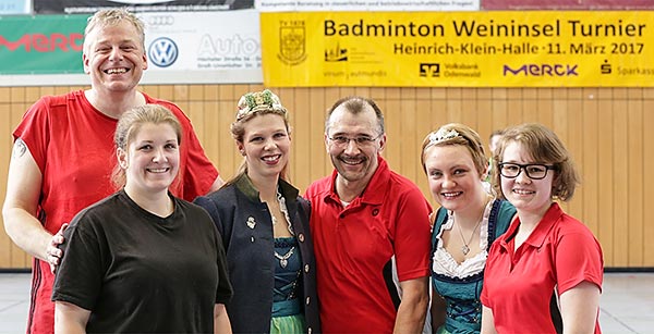 Mehr als 100 Sportler stellten sich an diesem Tag ihren Gegnern. Die Spielfelder waren bereits voll, als der Aufruf zur ersten Runde im 6. Weininsel Turnier angesagt wurde. Sogleich wurde auf 9 Feldern vom Warmspielmodus in den Turniermodus gewechselt. In der Vorrunde, wie auch in den nächsten Runden wurden alle Plätze ausgespielt. Das bedeutet, das mit den Kräften hausgehalten werden musste. In den Endspielen gingen die Kämpfe dann nicht selten über drei Sätze und dauerten 40 – 60 Minuten. Zu Siegerehrung herrschte begeisterte Stimmung in der Heinrich Klein Halle als die Sieger des 6. Weininsel Badminton Turniers die Podeste bestiegen. Die Preise wurden von den Groß-Umstädter Weinhoheiten, Wein-Königin Nina Schütz und Wein-Prinzessin Lara Ackermann überreicht. Bei dem gemischten Doppel wurde der 1. Platz an Christine Kirschner / Sundeep Matharu vergeben, der 2. Platz an Laura Günster / Andreas Süß und der 3. Platz an Shu Xu Luan / Hao Sun.