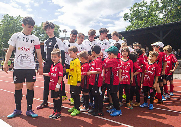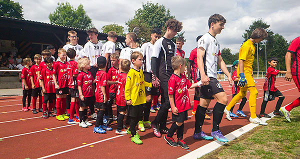 Bei herrlichem Wetter und einen tollen Rahmen liefen die Spieler beider Teams unterstützt durch Einlaufkinder der F2- und E1-Junioren unter großem Applaus auf den Platz.
