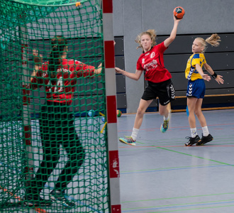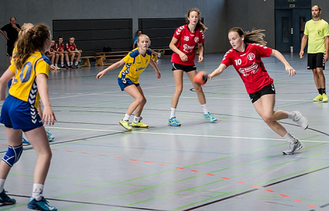 Weiter ging es am Samstag ab 9 Uhr in zwei Hallen mit dem Turnier der weiblichen Jugend D. In zwei 5er Gruppen wurden zunächst die Teilnehmer der Halbfinalspiele ausgespielt. Hier konnten sich am Taubenberg die SG Bretzenheim und der TuS Nordenstadt und in der Hexenturmhalle die TSG Bürgel und unsere Junghexen qualifizieren. Unsere Mannschaft gewann in der Vorrunde alle Spiele mit deutlichem Abstand. Als Gruppensieger traf man auf den Zweitplatzierten der Gruppe B, den TuS Nordenstadt. Hier quälten sich unsere Mädels zu einem zwar ungefährdeten Sieg, aber man merkte den Mädels deutlich an, dass die Mittagspause am Grill verbracht wurde.