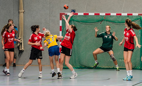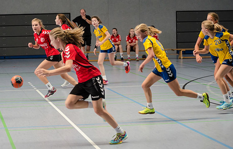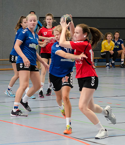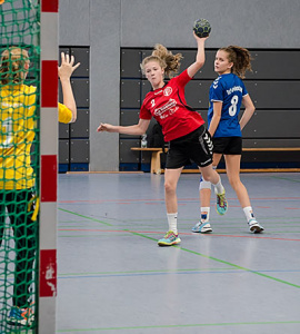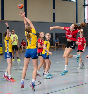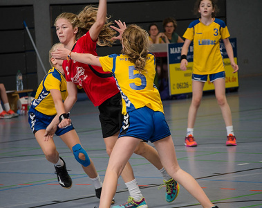 Am Nachmittag griffen 11 Mannschaften der weiblichen Jugend B ins Turniergeschehen ein. Hier war das Teilnehmerfeld besonders vielfältig, was die Anreisen angeht. Mit der JSG Münden konnten wir hier sogar eine Mannschaft aus Niedersachsen unterm Hexenturm begrüßen. Aber auch Mannschaften aus Rheinhessen, dem Raum Mannheim und Offenbach und natürlich auch aus dem eigenen Bezirk fanden sich in einer der beiden Hallen ein, um in vier Gruppen die Halbfinalgegner zu ermitteln.