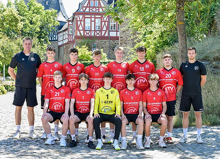 hinten v. l.: Max Bär (Trainer), Leon Böhm, Konrad Prause, Samy Viererbe, Lukas Bär, Simon Fleck, Tom Eisenbarth, Pay Graulich (Trainer)