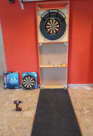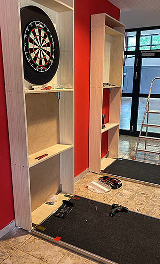 Erdan Avdolla konstruierte Schränke und besorgte entsprechendes Material für den Aufbau der vier Dart-Schränke. Der Clou: Die Schranktür ist innen mit Teppich belegt, geht nach unten auf, ist begehbar und sorgt für den richtigen Abstand zur Scheibe! Die Scheibe ist im Hintergrund beleuchtet und um die Scheibe ist ein Kunsstoffring, der die Pfeile auffängt, die nicht die Scheibe treffen. Beim Aufbau halfen auch Arsin Murati und weitere Mitglieder.