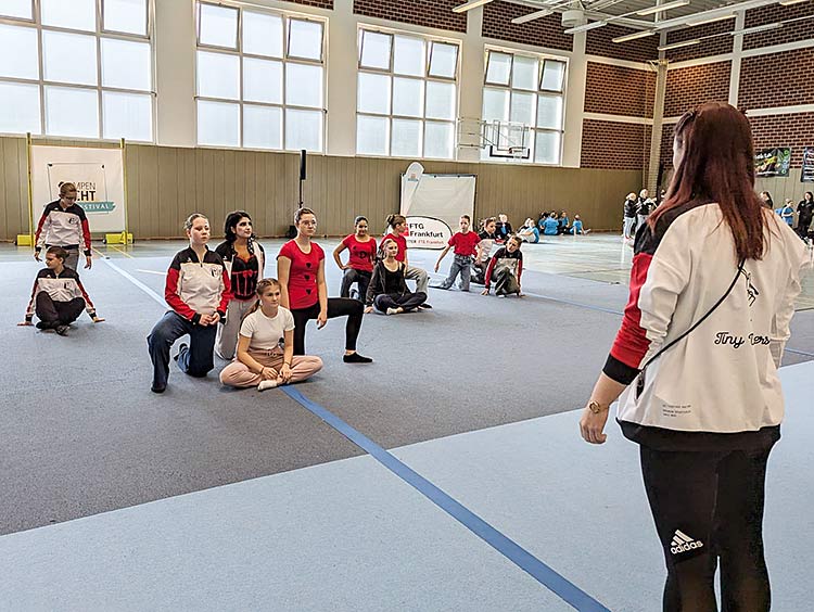 In der Halle der FTG Frankfurt haben wir zunächst unsere Umkleide gesucht und die Tanzfläche bei einer Stellprobe kennengelernt.